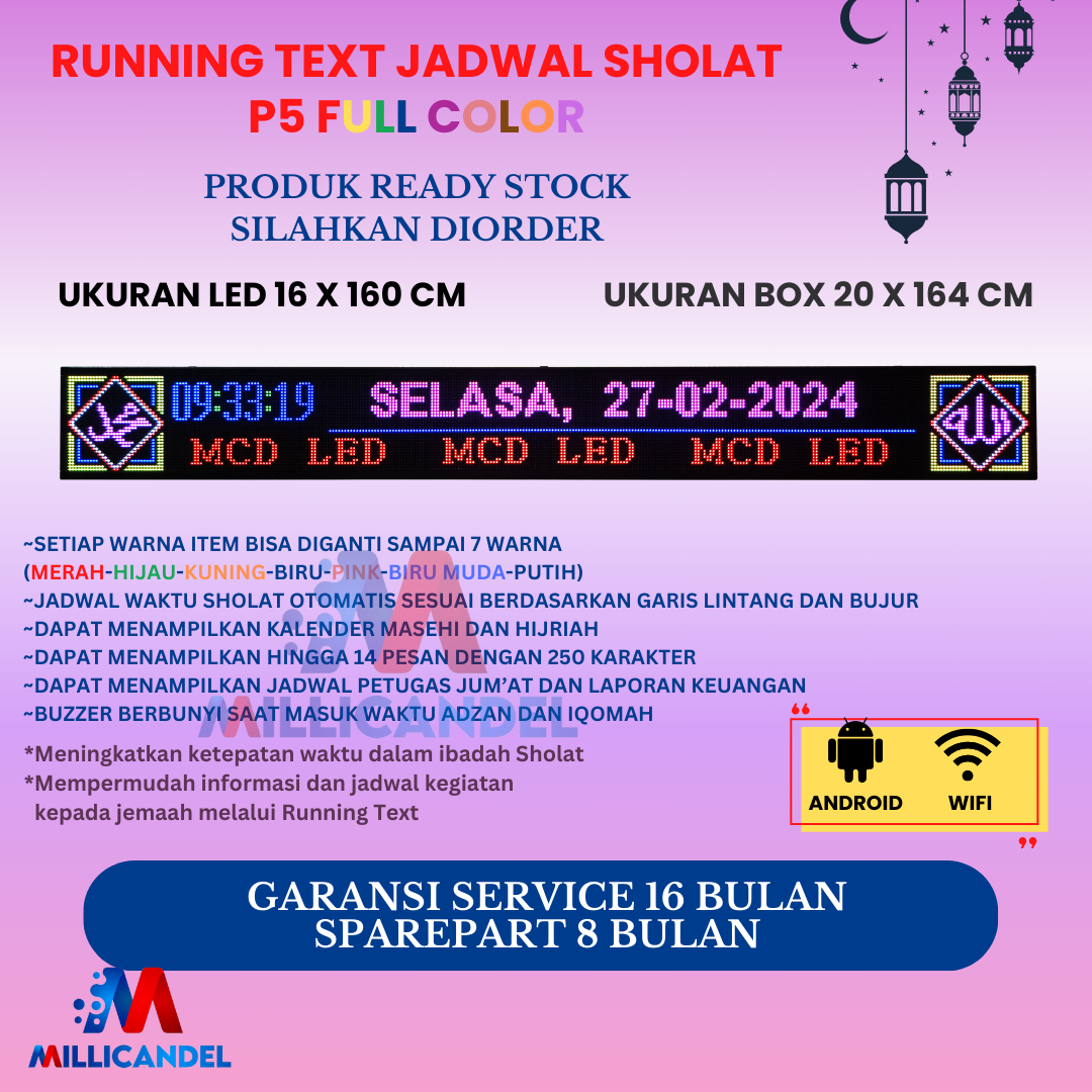 – Kapasitas memory untuk running text sampai 14 slot dengan masing-masing slot dapat menampung 250 karakter. Kita bisa mengatur text informasi sesuai yang kita inginkan, dan bisa diatur kapan text akan ditampilakan menyesuaikan berdasarka waktu / tanggal.