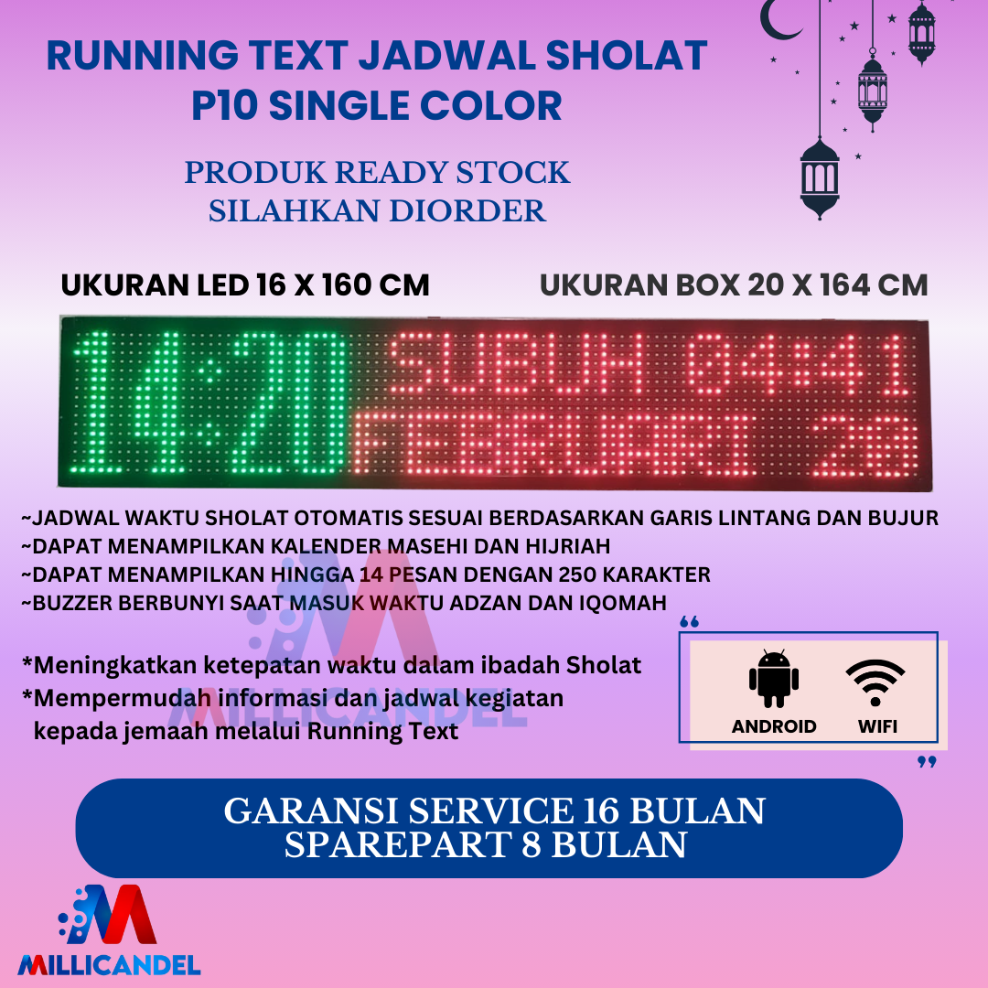 – Kapasitas memory untuk running text sampai 14 slot dengan masing-masing slot dapat menampung 250 karakter. Kita bisa mengatur text informasi sesuai yang kita inginkan, dan bisa diatur kapan text akan ditampilakan menyesuaikan berdasarka waktu / tanggal.